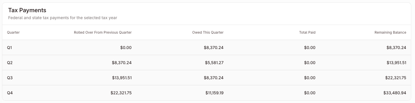 - Payment Tracking: Record and track quarterly tax payments with due dates