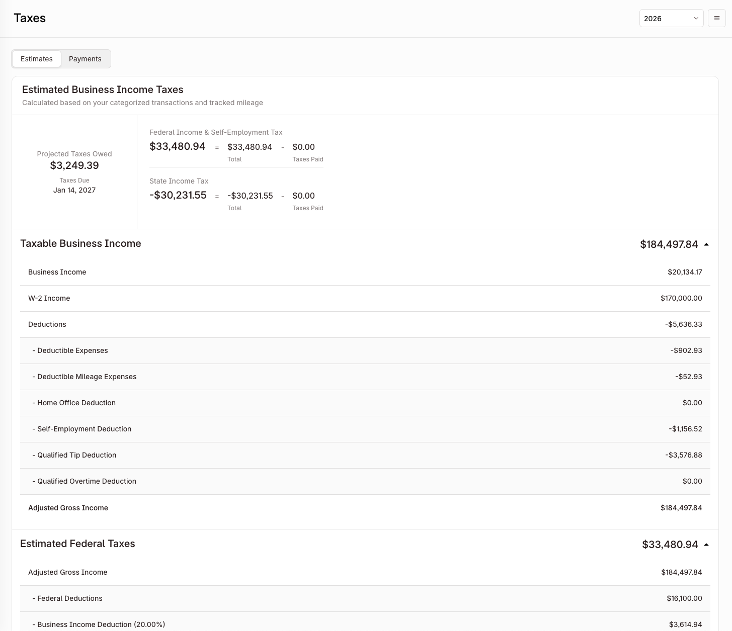 Once onboarded, users see a tabbed interface: Estimates Tab - Summary card with total estimated taxes and expandable sections for:- Taxable Business Income (revenue, expenses, deductions)